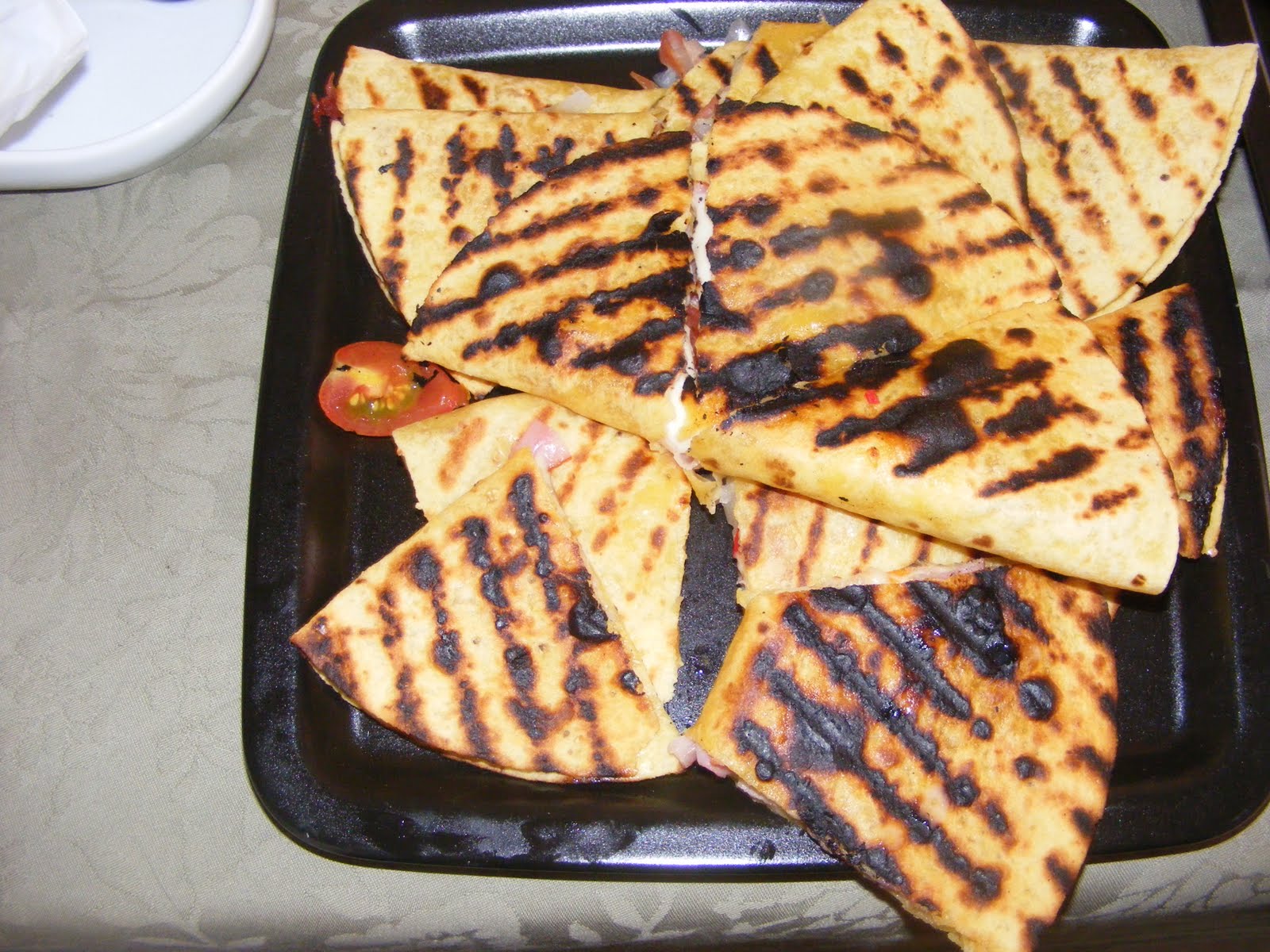 1. Coloquem em metade da tortilha o presunto e por cima deste a cebola, as malaguetas e o queijo ralado.
